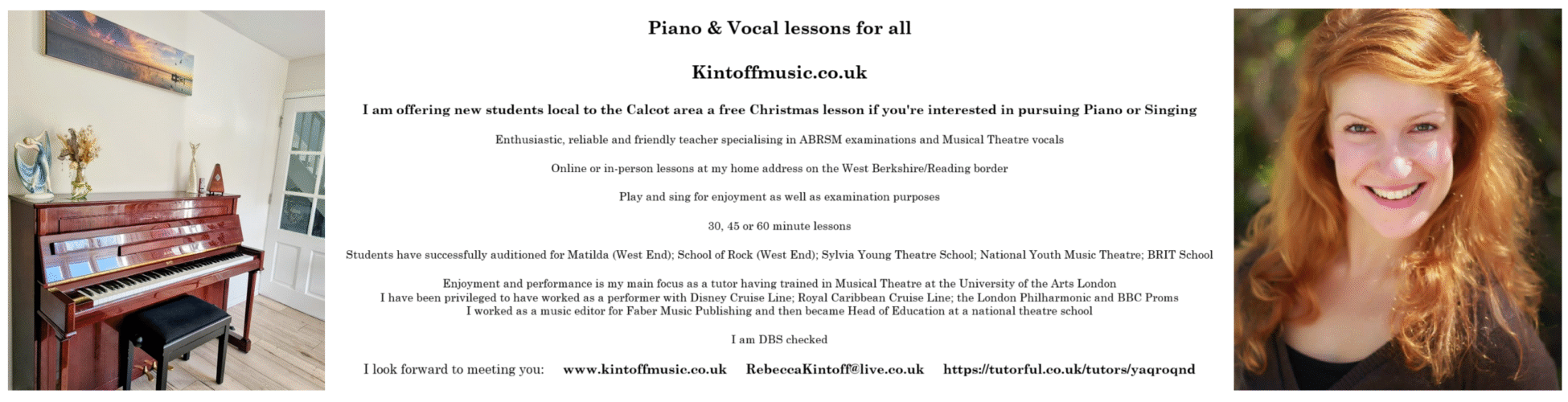 | About | Enjoyment and performance is my main focus as a tutor having trained in Musical Theatre at the London Studio Centre, University of the Arts London. I have been privileged to have worked as a performer with Disney Cruise Line; Royal Caribbean Cruise Line; a number of UK national tours and international tours; the London Philharmonic Choir and BBC Proms. For the last five years since covid, I’ve loved putting my knowledge into teaching students of all ages in London and have recently moved to West Berkshire for a quieter life. Alongside my teaching, I worked as a music editor for Faber Music Publishing, editing works such as the official Harry Potter Piano Anthology and educational books by composers including Paul Harris, Pam Wedgewood and Elaine Gould. I then became Head of Education at the national theatre school, “Perform”. I look forward to transferring back to teaching full time and focusing on those local to my new area in West Berkshire and Reading as I raise my own family. See you soon. |
