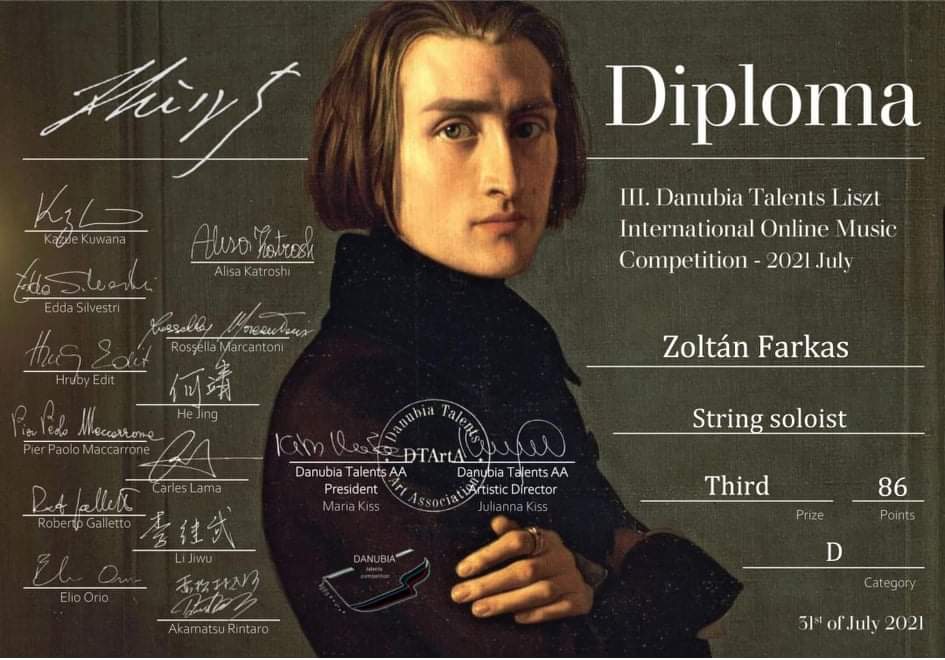 Winning third prize at the III. Danubia Talents Liszt International Online Music Competition in 2021.